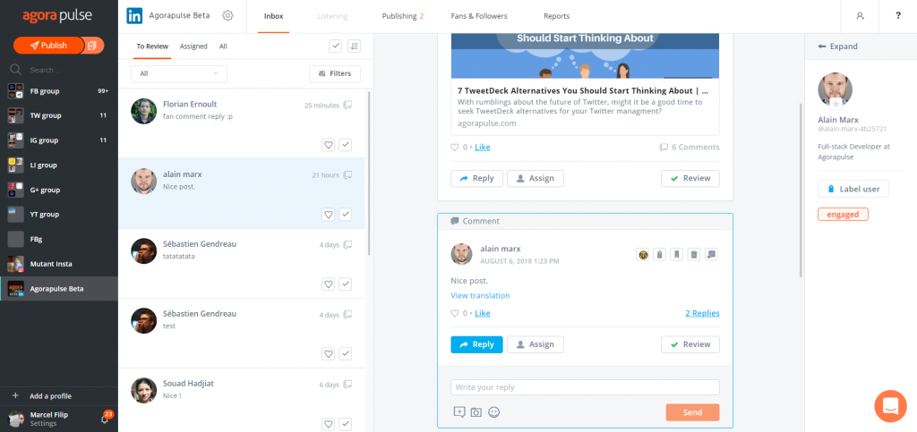 The inbox is available for both company pages and profiles. You can easily find all the comments on your LinkedIn posts. Go down the list and like, reply, remove, assign, review, label, or bookmark your comments.